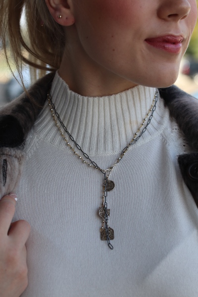 Double chain of oxidized sterling silver and hand wired pyrite chain embellished with antique silver prayer amulets from India