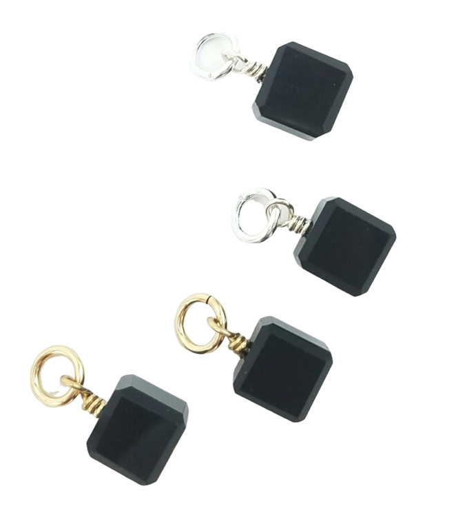 Product Description 10 mm black Swarovski crystal cube charms to be worn on hoops. Available in silver or gold.