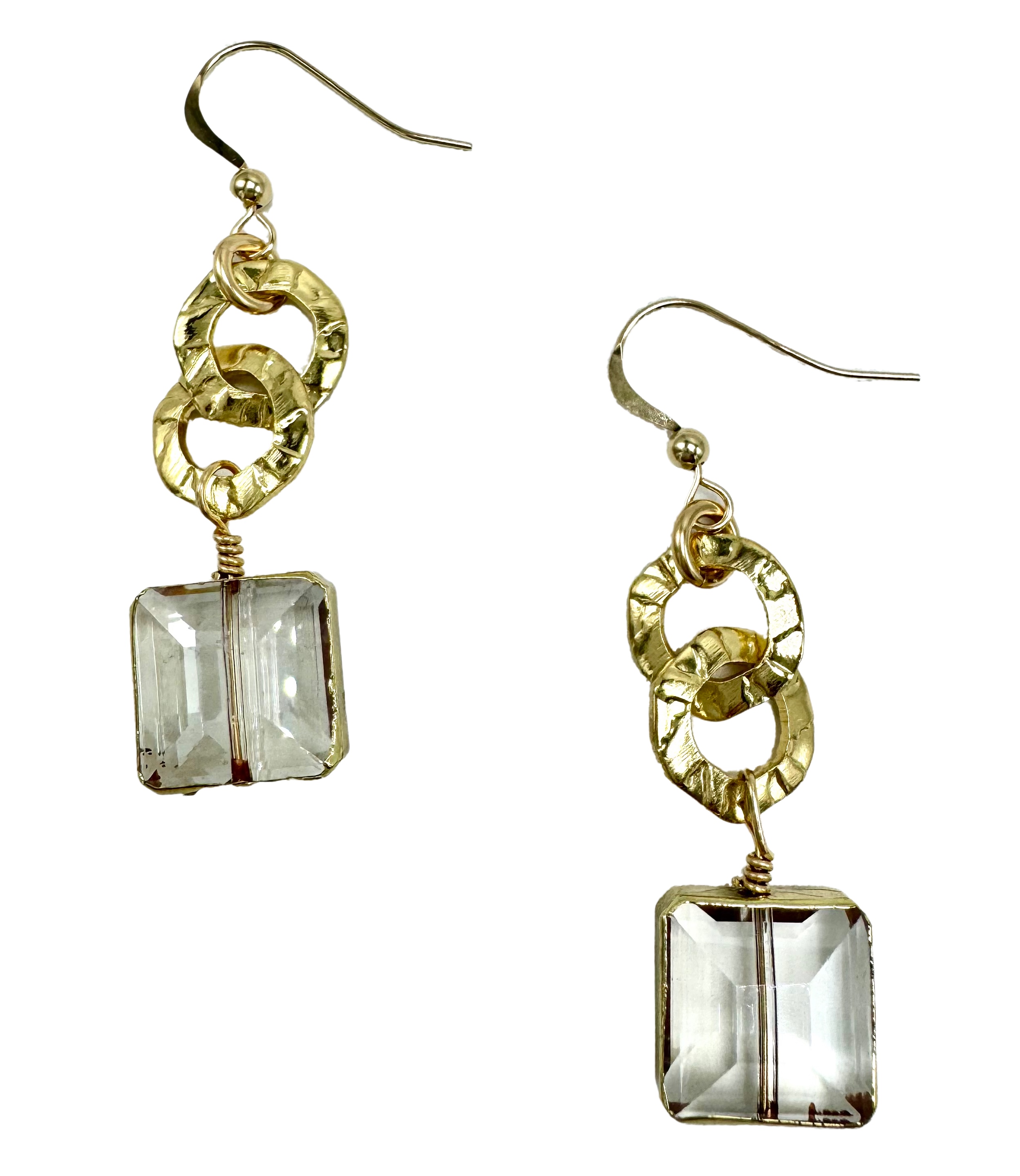 Product Description Double hammered circle chain with clear quartz encased in gold on gold filled french ear wires