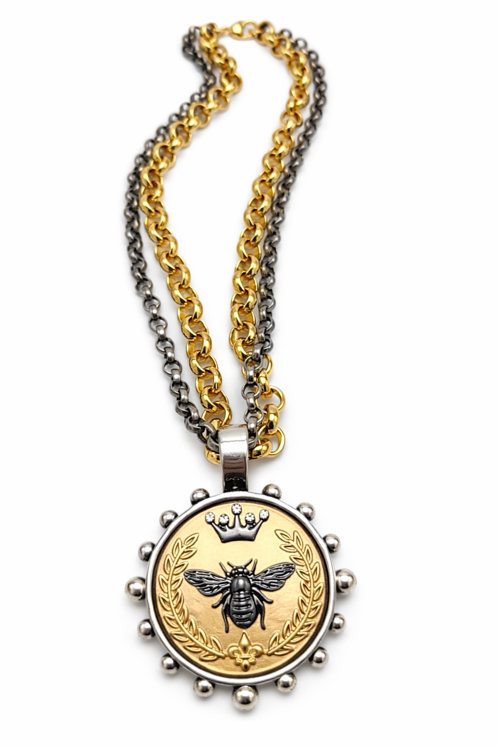 Product Description Double gold and silver rolo chain with gold and silver pendant with black bee embellished with crystals.