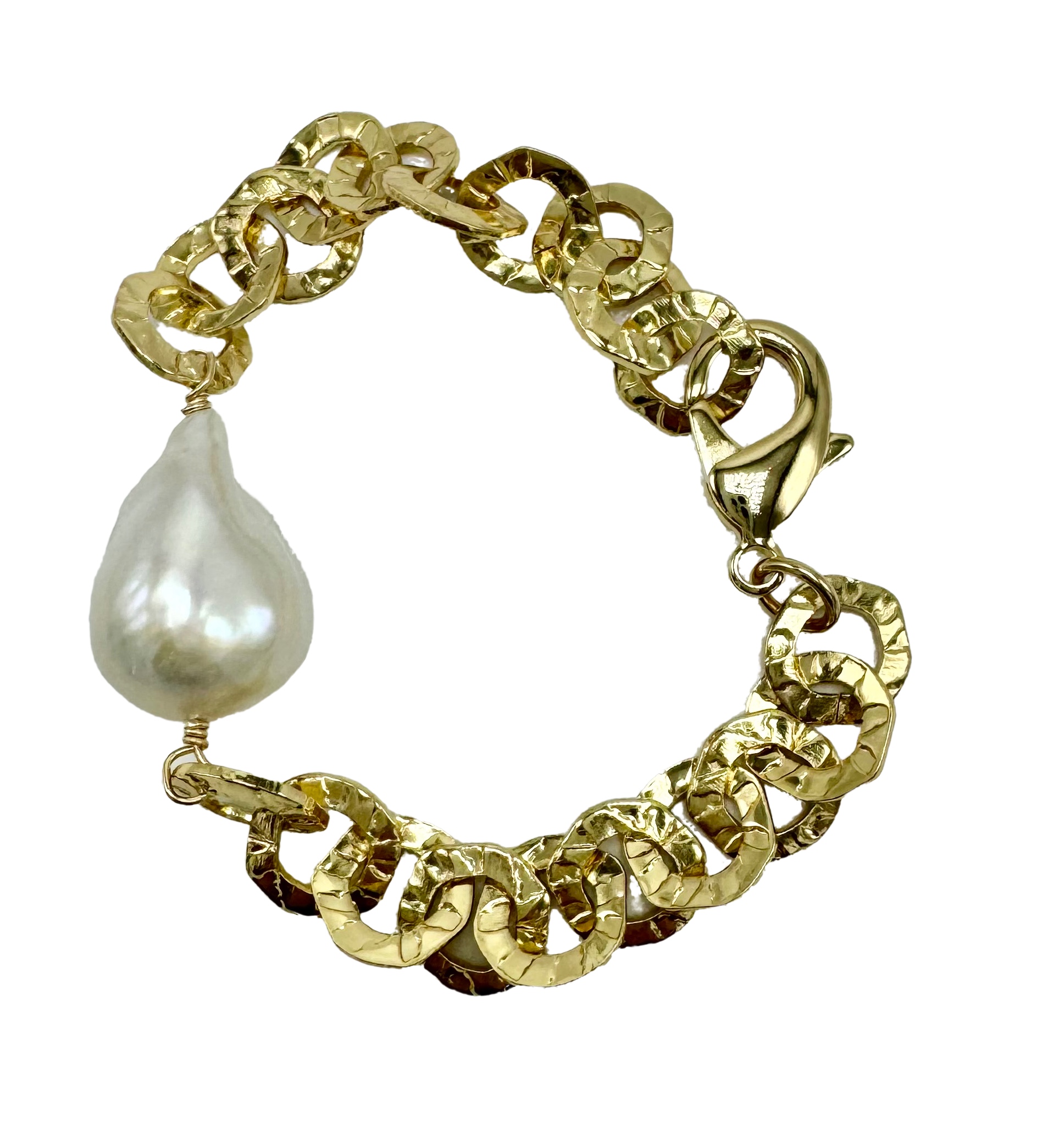 Product Description Large gold hammered circle chain with extra large grade A baroque pearl with gold lobster
