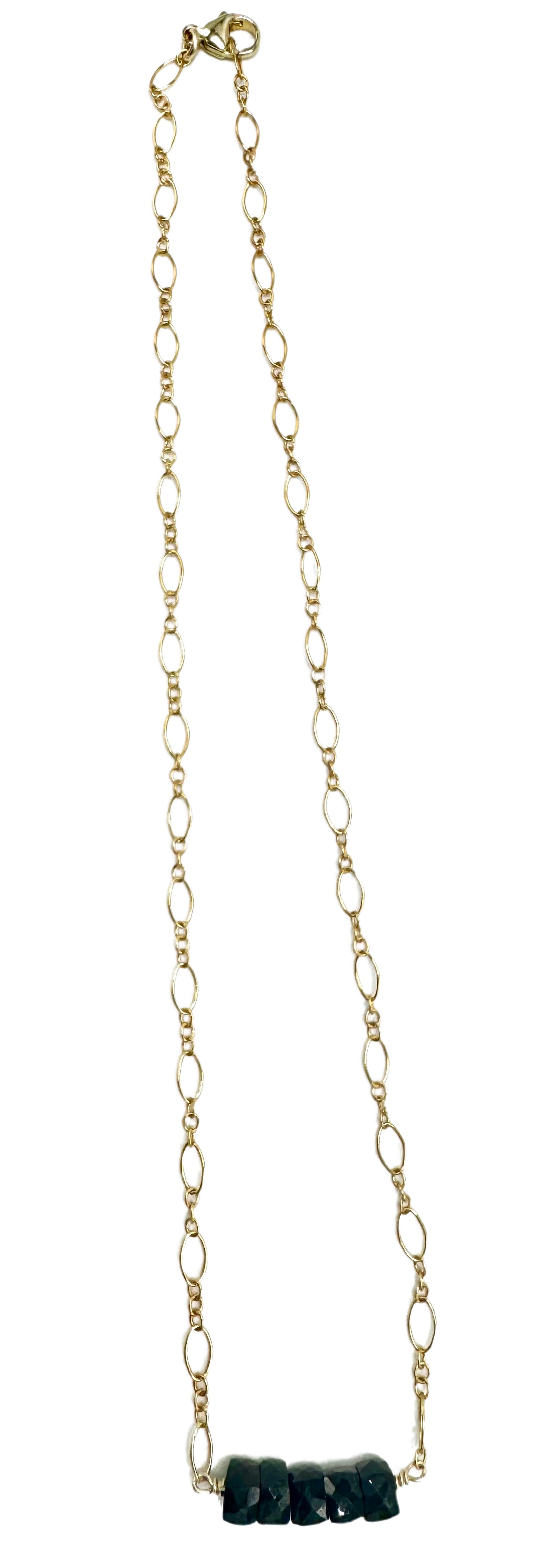 Add to Cart Long Gold Necklace with Black Spinel Cubes MSRP: Was: Now: $75.00 34" gold chain with hand wired black faceted spinels