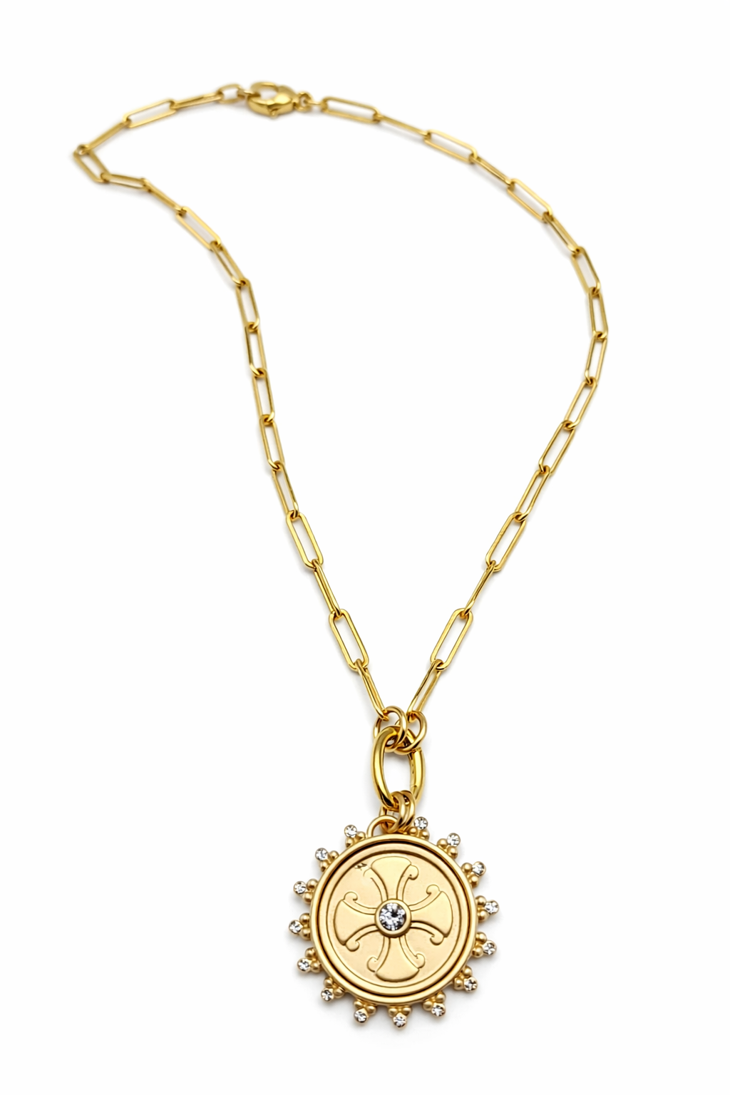 Short gold filled chain with gold filled carabiner that allows interchangeable charms. The charm on this necklace is a gold CZ cross pendant.