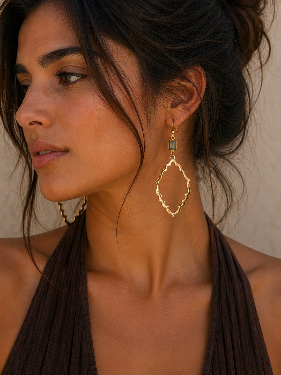 Gold-toned Moroccan-inspired open drop design accented with gold encased labradorite on gold filled french ear wires