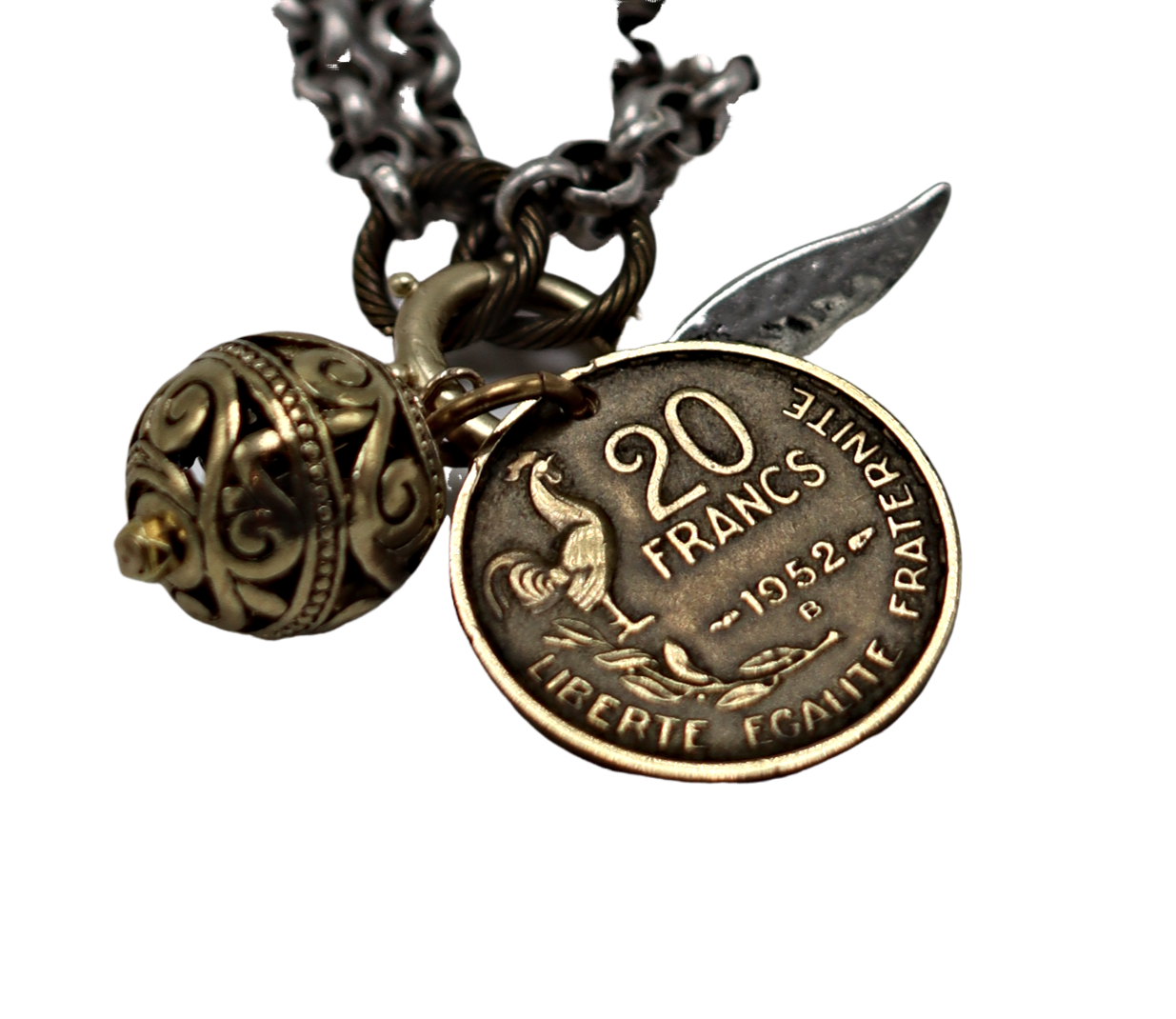 Add to Cart Layered Chain Charm Necklace MSRP: Was: Now: $280.00 Combination of gold Chain with gold/silver coin 16" silver chain with gold and CZ finding 17" gol…