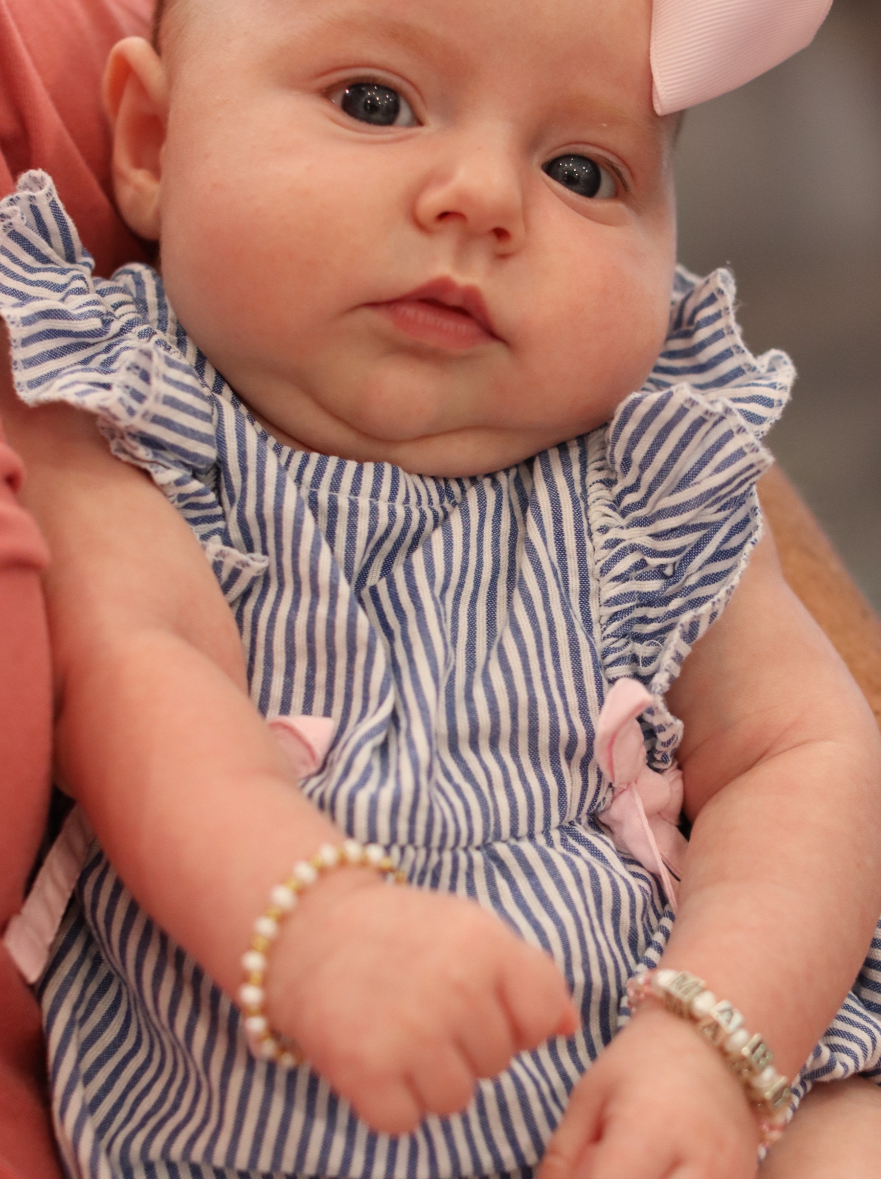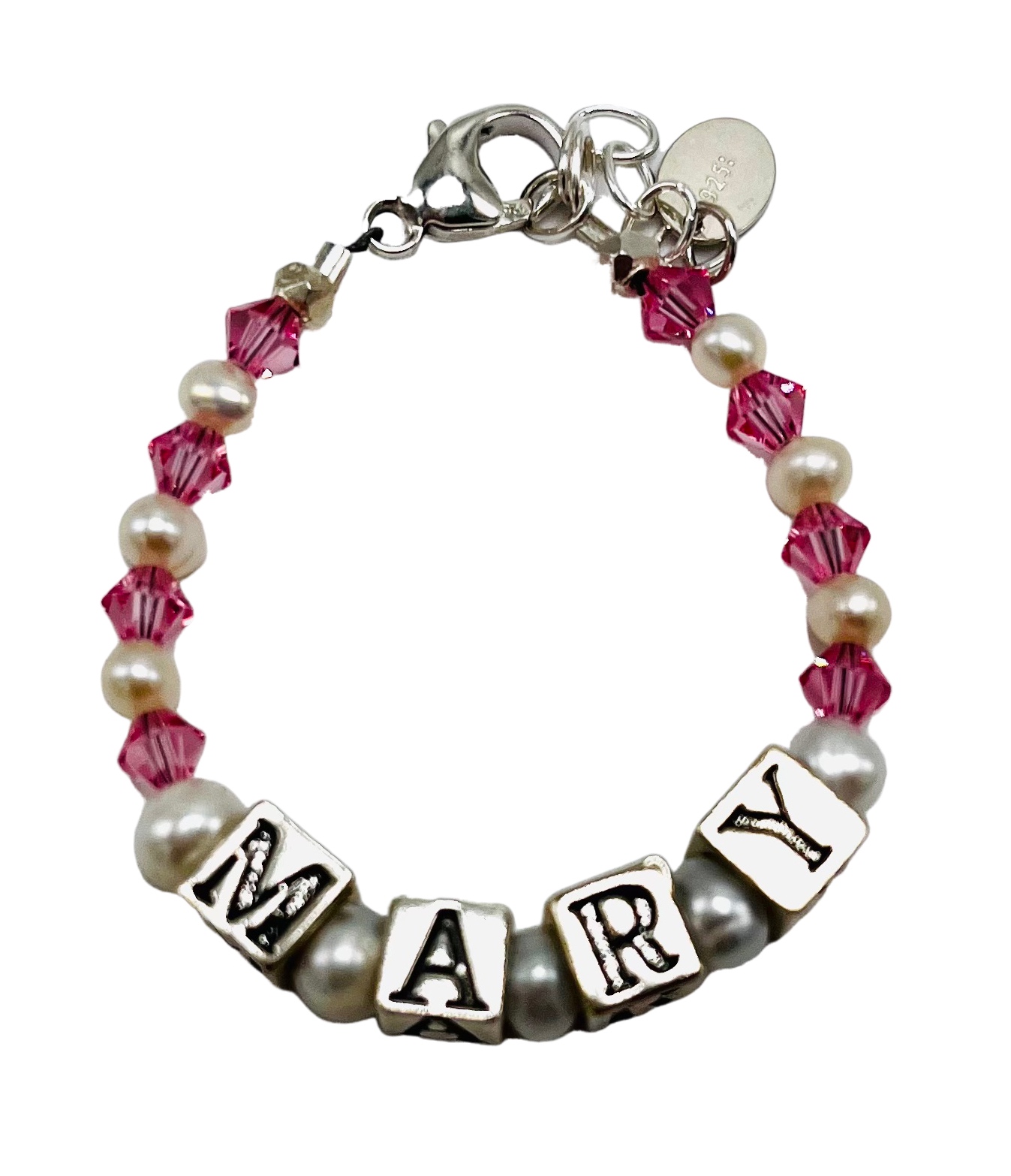 Sterling silver letter cubes with pearls and Swarovski crystals. Perfect gift for a baby or mother!. We have added a 1" extender to allow for growth but you can request that we do not add it. Since these are custom you can ask for other colors, etc. Just make a note on your order.