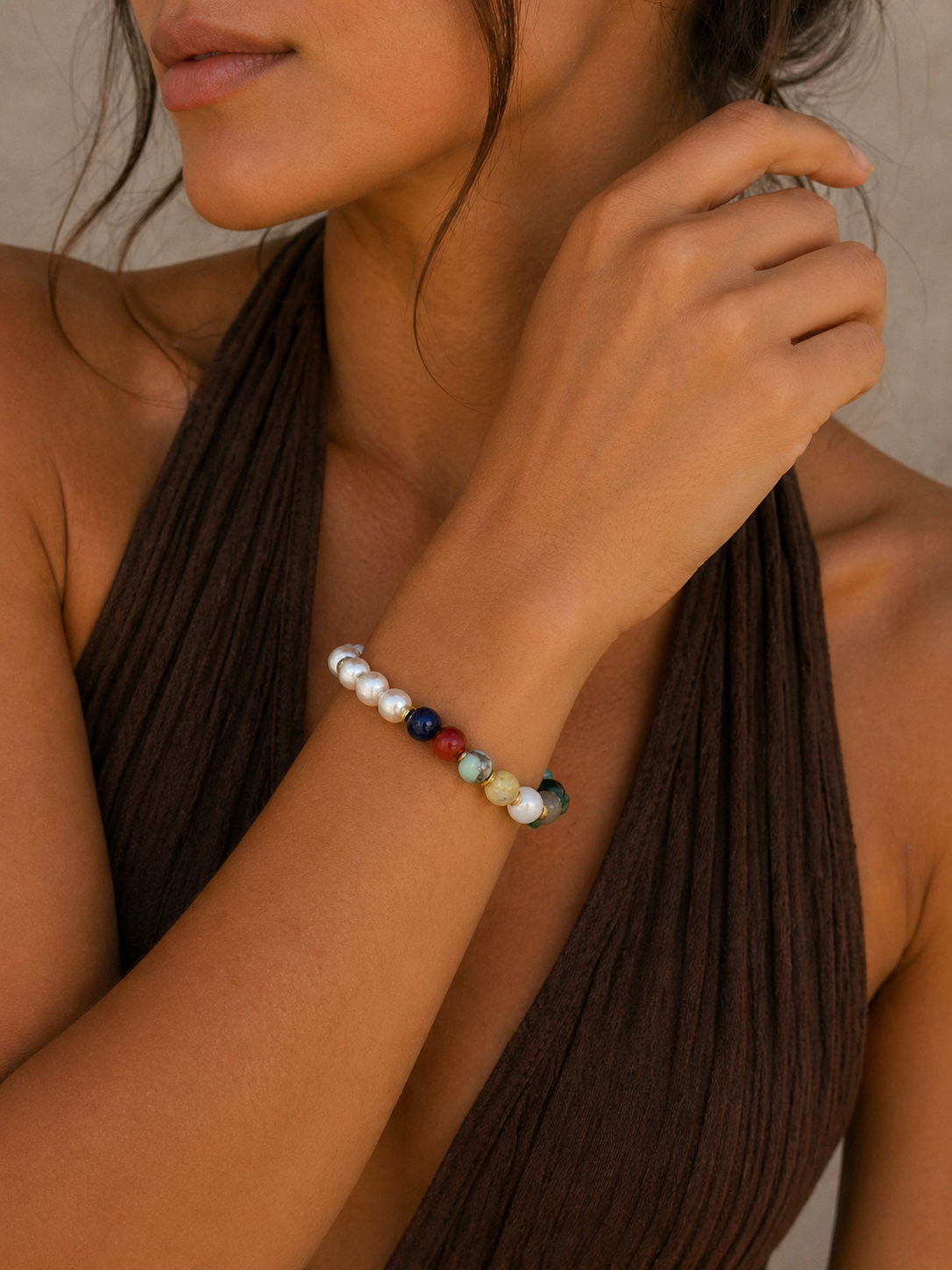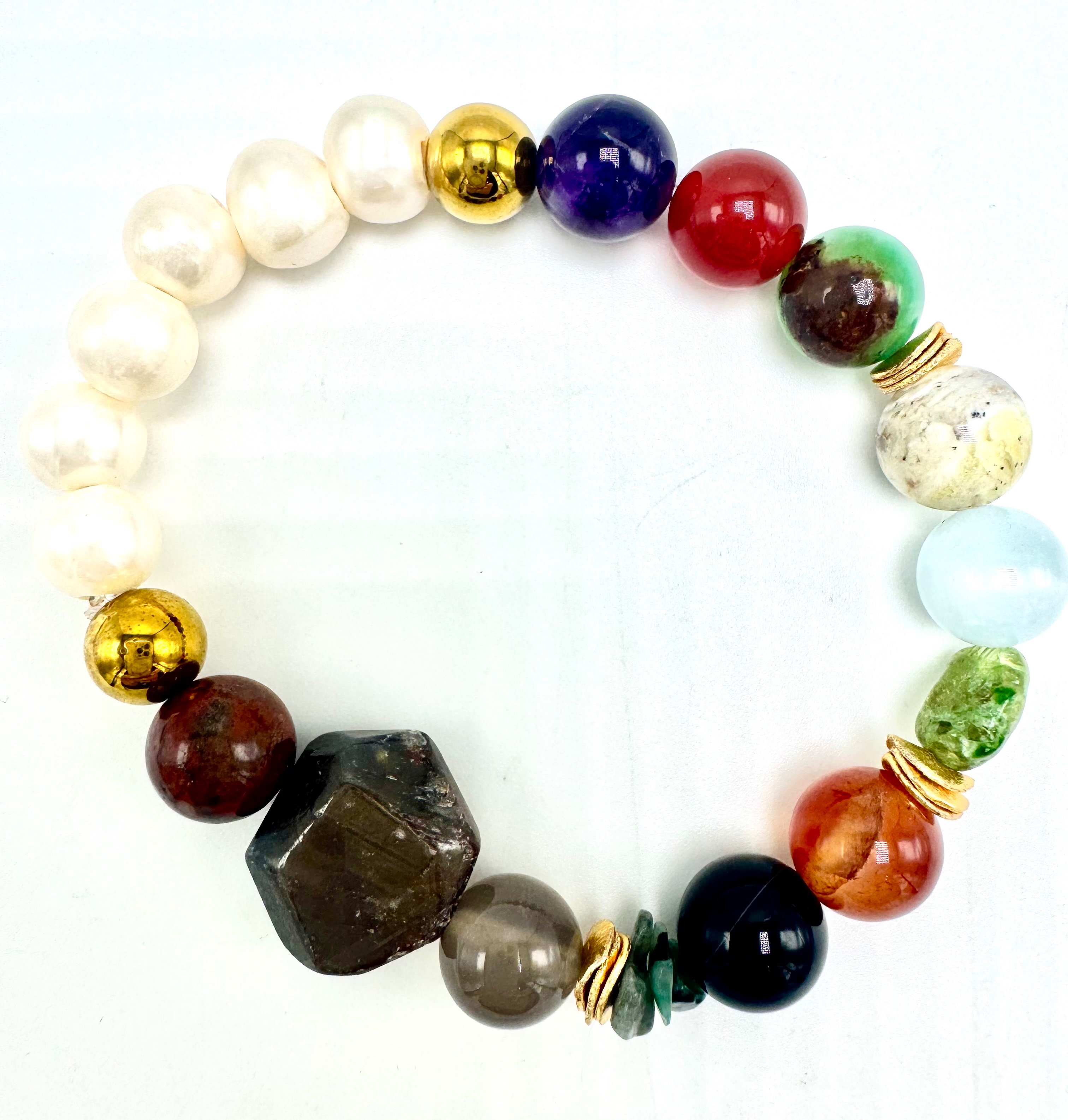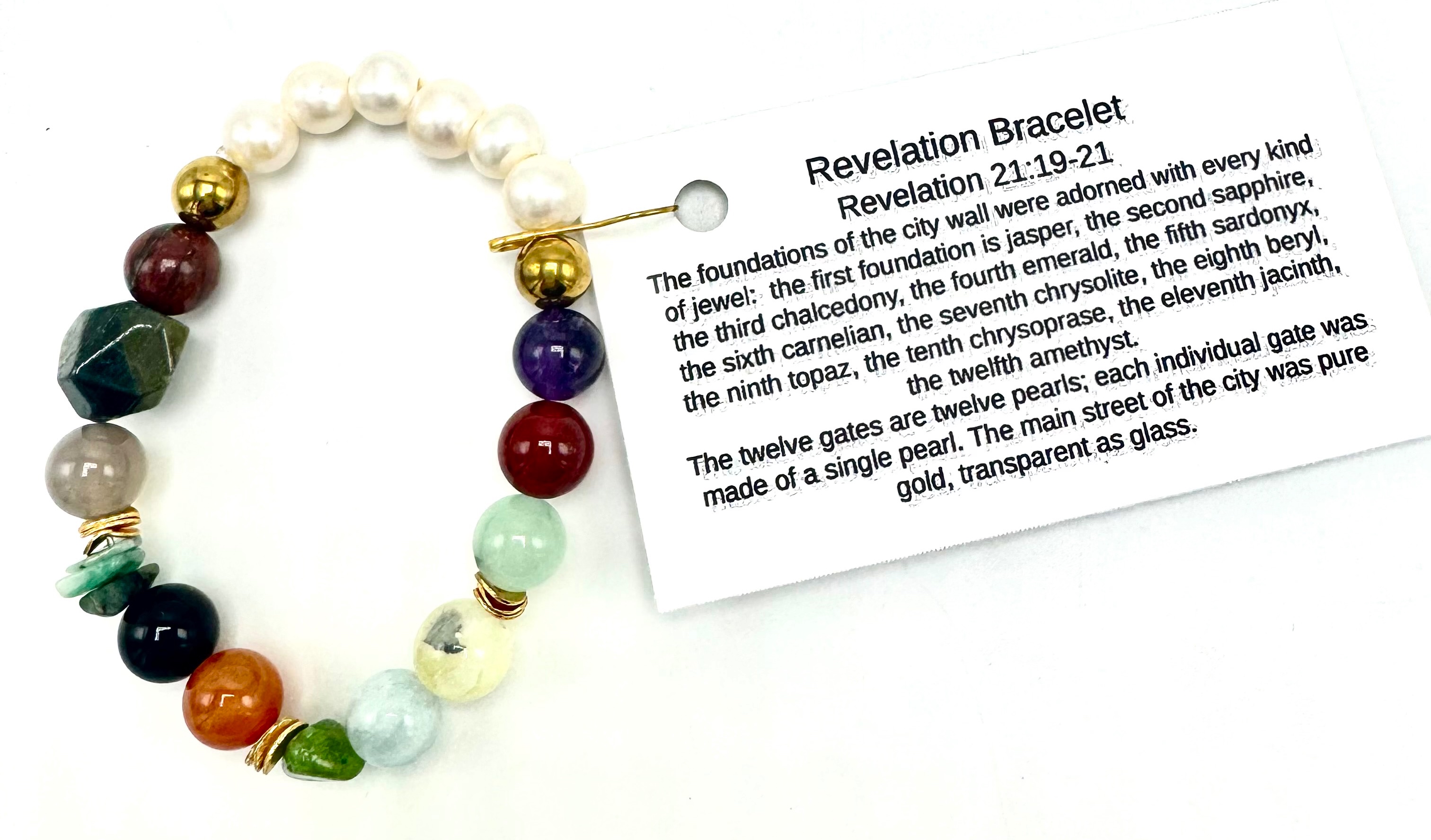 This bracelet represents the stones discussed in Revelation 21:19-21 They are jasper, sapphire, chalcedony, emerald, sardonyx, carnelian, chrysolite, beryl, topaz, chrysoprase, jacinth, amethyst, pearls and gold. The gemstones and gold pieces will vary. A laminated description will be included with each bracelet.