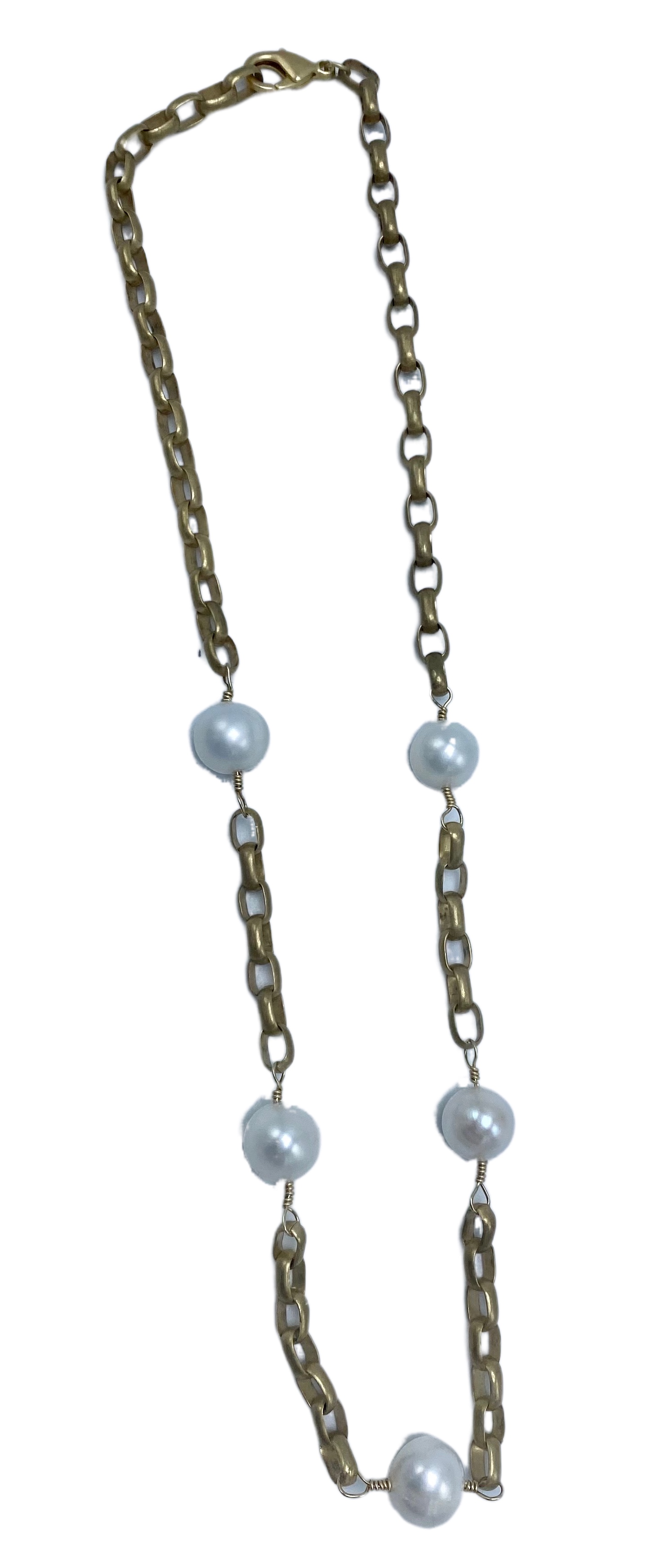 Product Description Short gold elongated rolo chain with hand wired 10mm almost perfect white freshwater pearls with 1" extender.