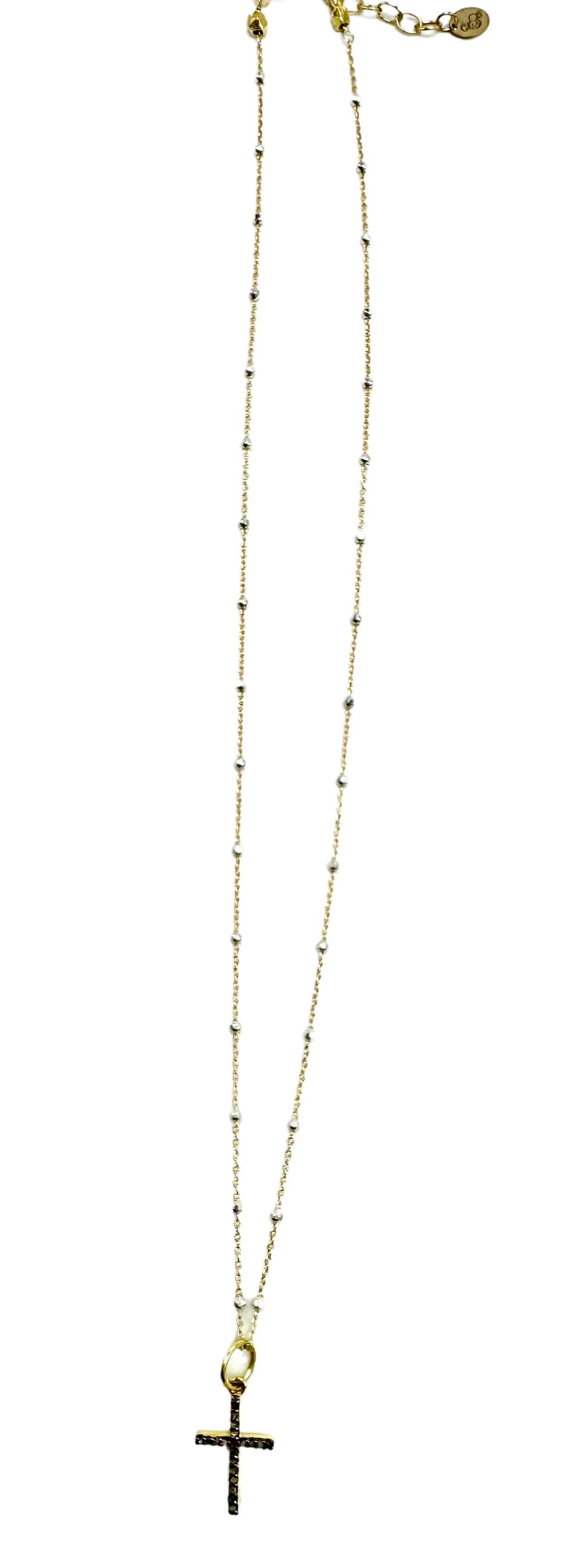 Product Description 16"t gold filled chain with silver cubes and black and gold diamond cross with 1" extender