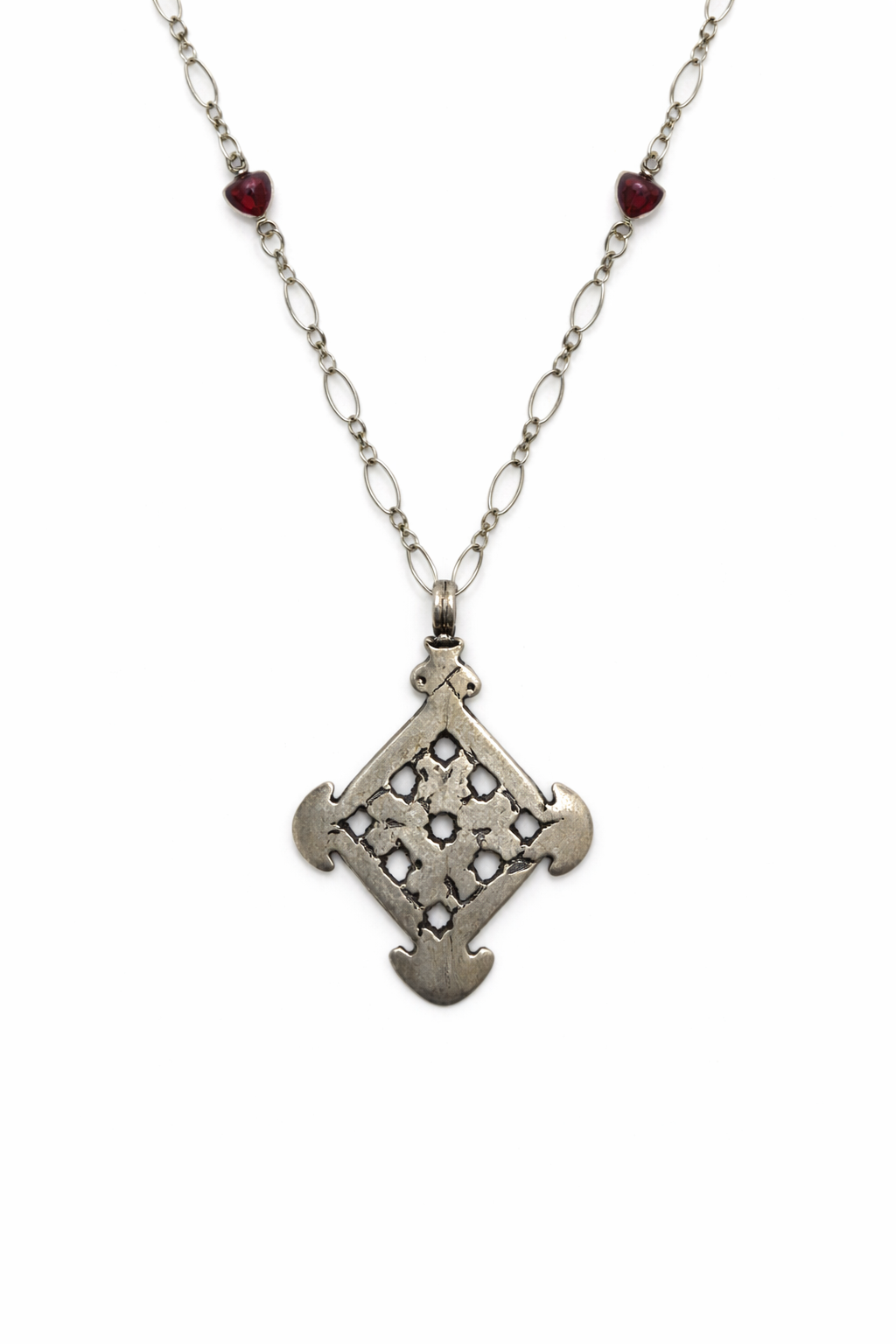18" sterling silver chain with garnet stations and 300 year old antique pendant which was hand forged from melted silver Marie Teressa coins and are 100% colin silver.