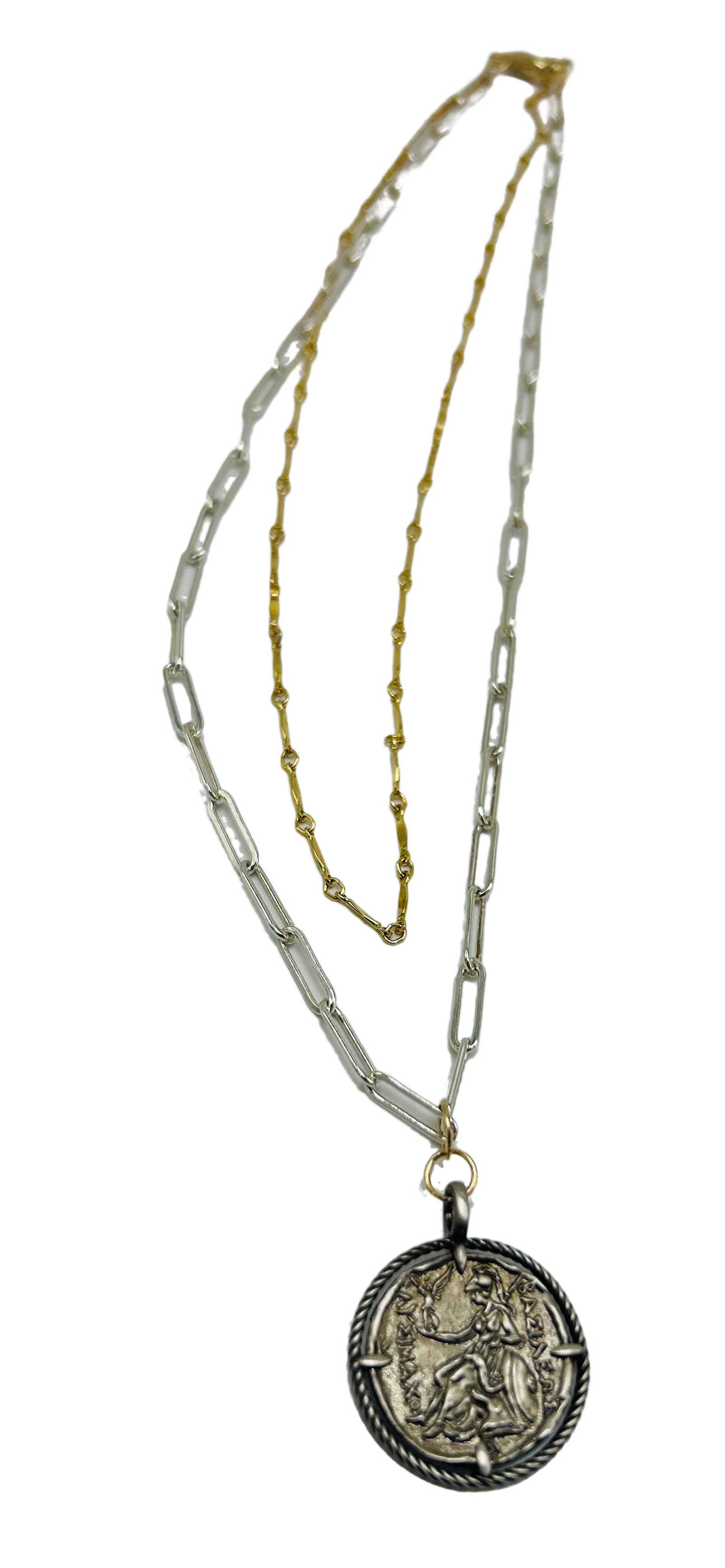 Choose Options Sterling Silver Chain with Vintage Silver and Gold Coin MSRP: Was: Now: $75.00 Sterling silver paper clip chain with vintage gold and silver coin.